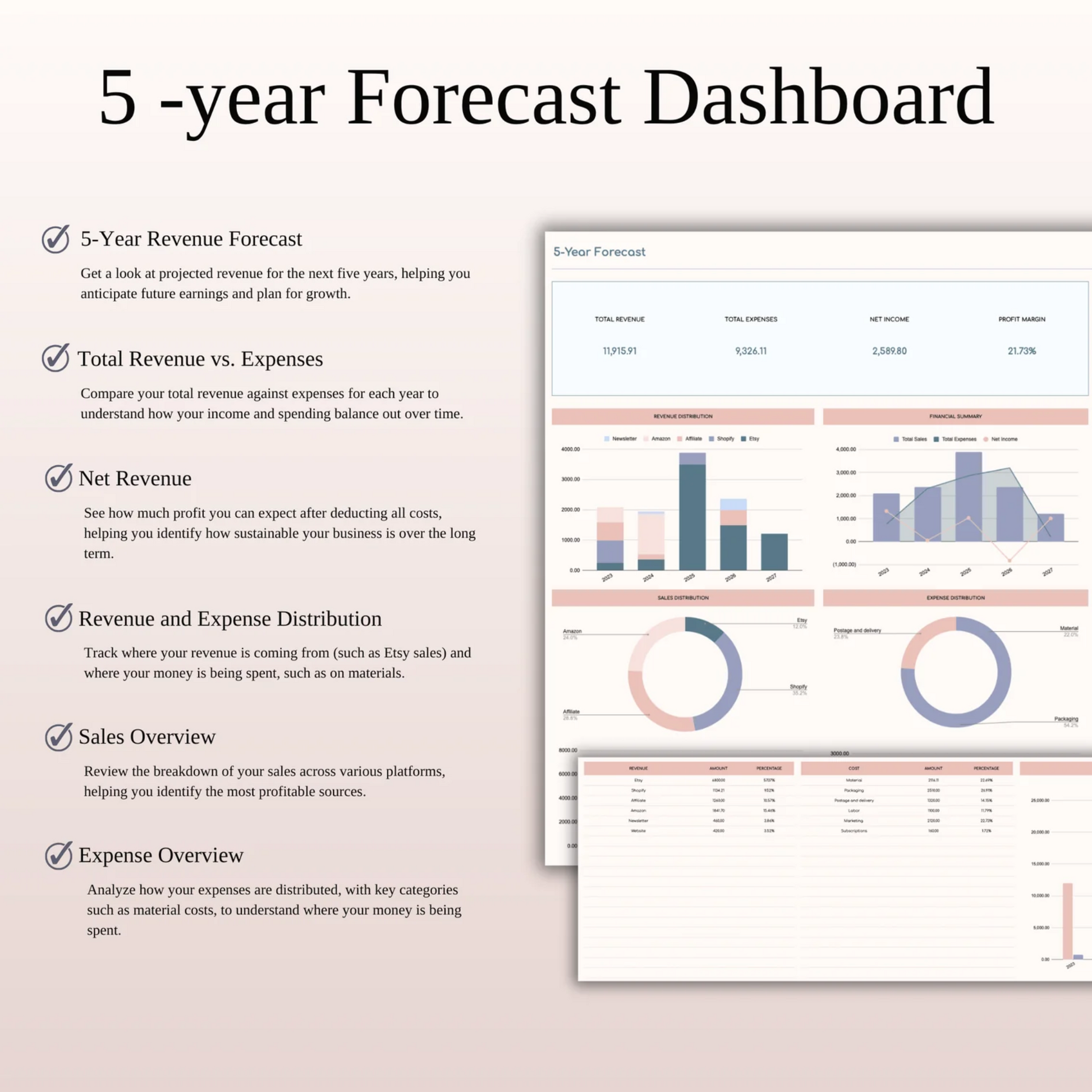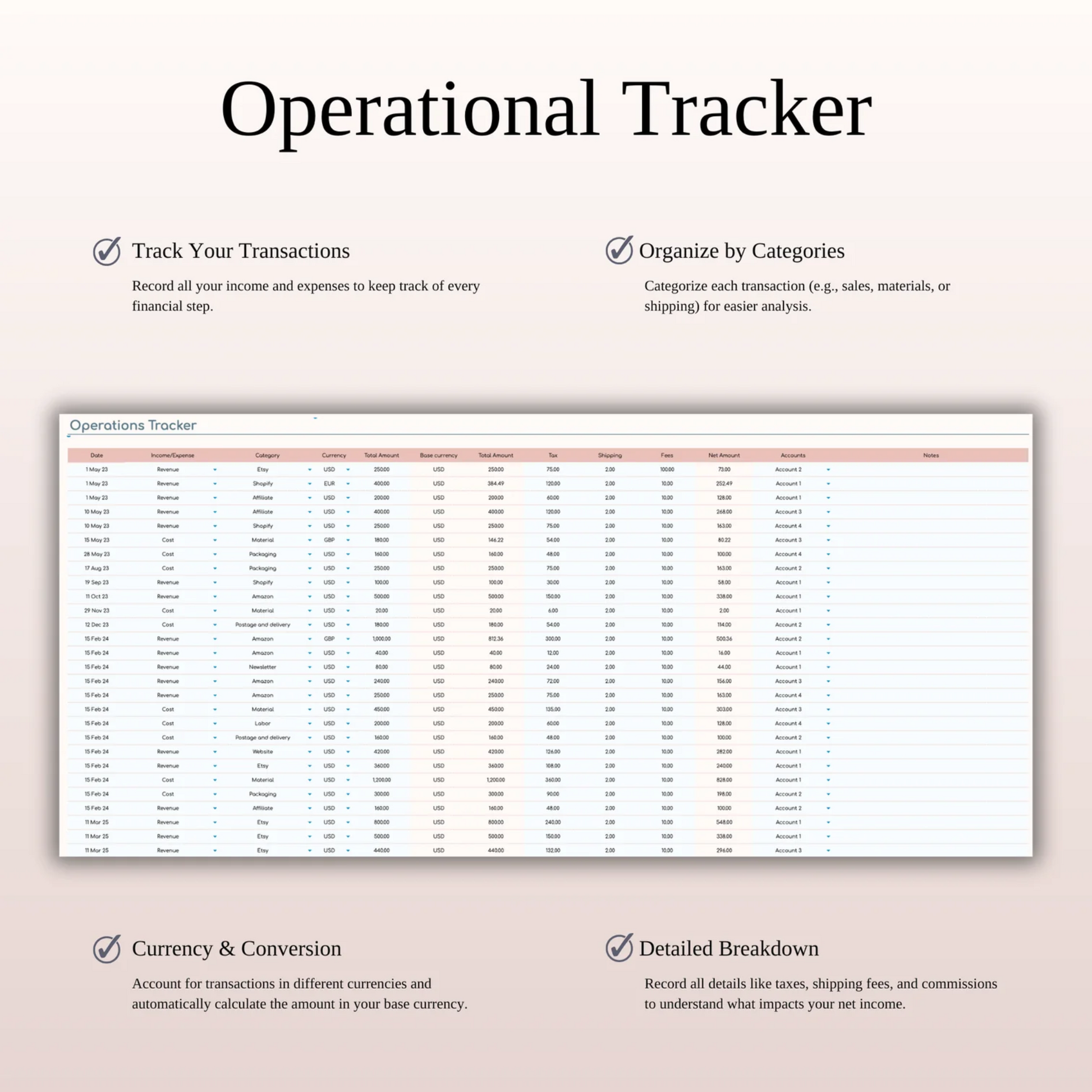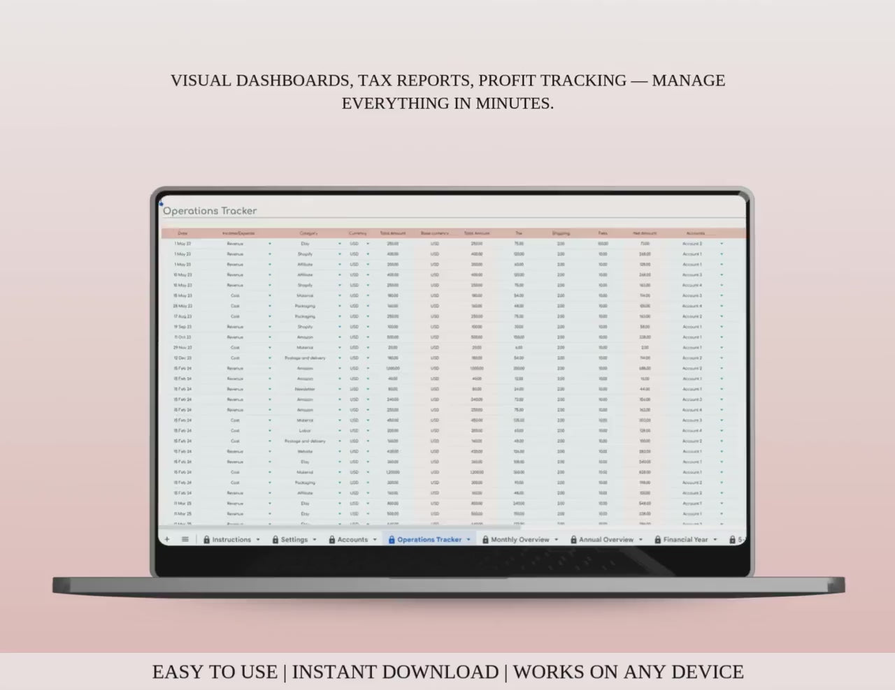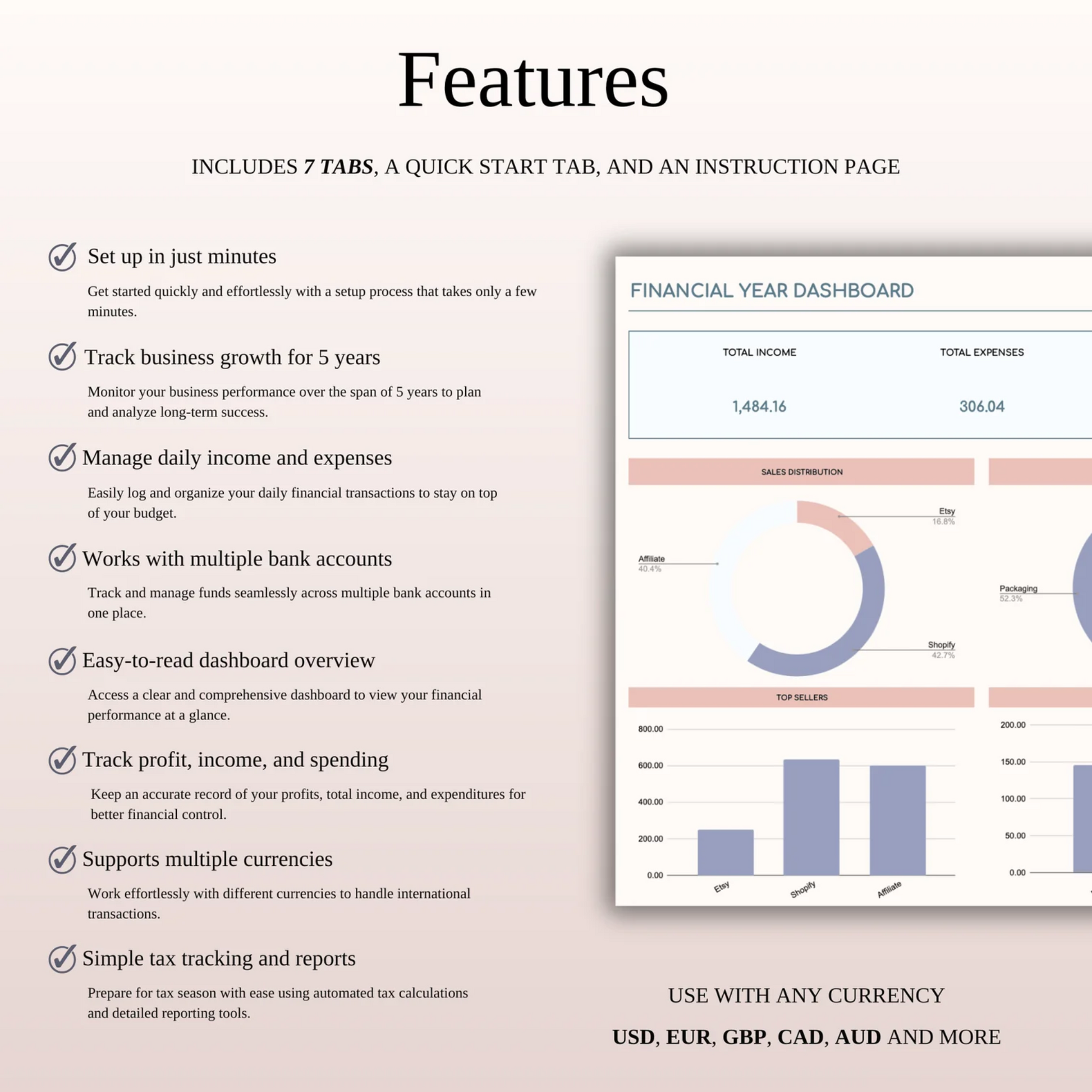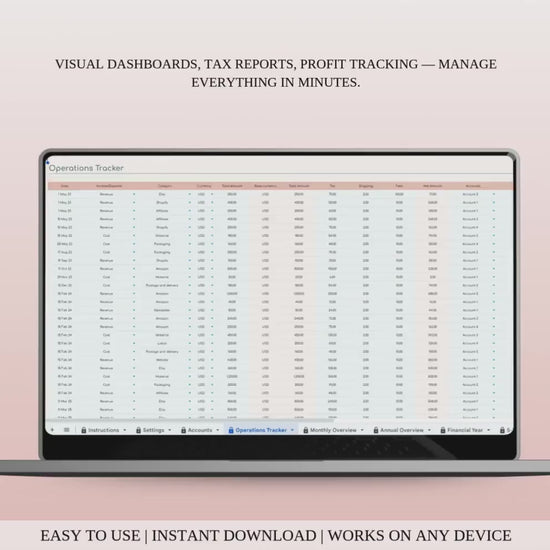 Easily manage your business finances with this user-friendly Bookkeeping Template for Excel & Google Sheets. Keep track of your income, expenses, and profits effortlessly. Gain valuable insights into your business performance with a 5-year dashboard that features monthly, yearly, and cumulative tracking. Just input your transactions, and the template will handle the calculations for you! Designed specifically for small business owners, this accounting tool makes bookkeeping simple and efficient.