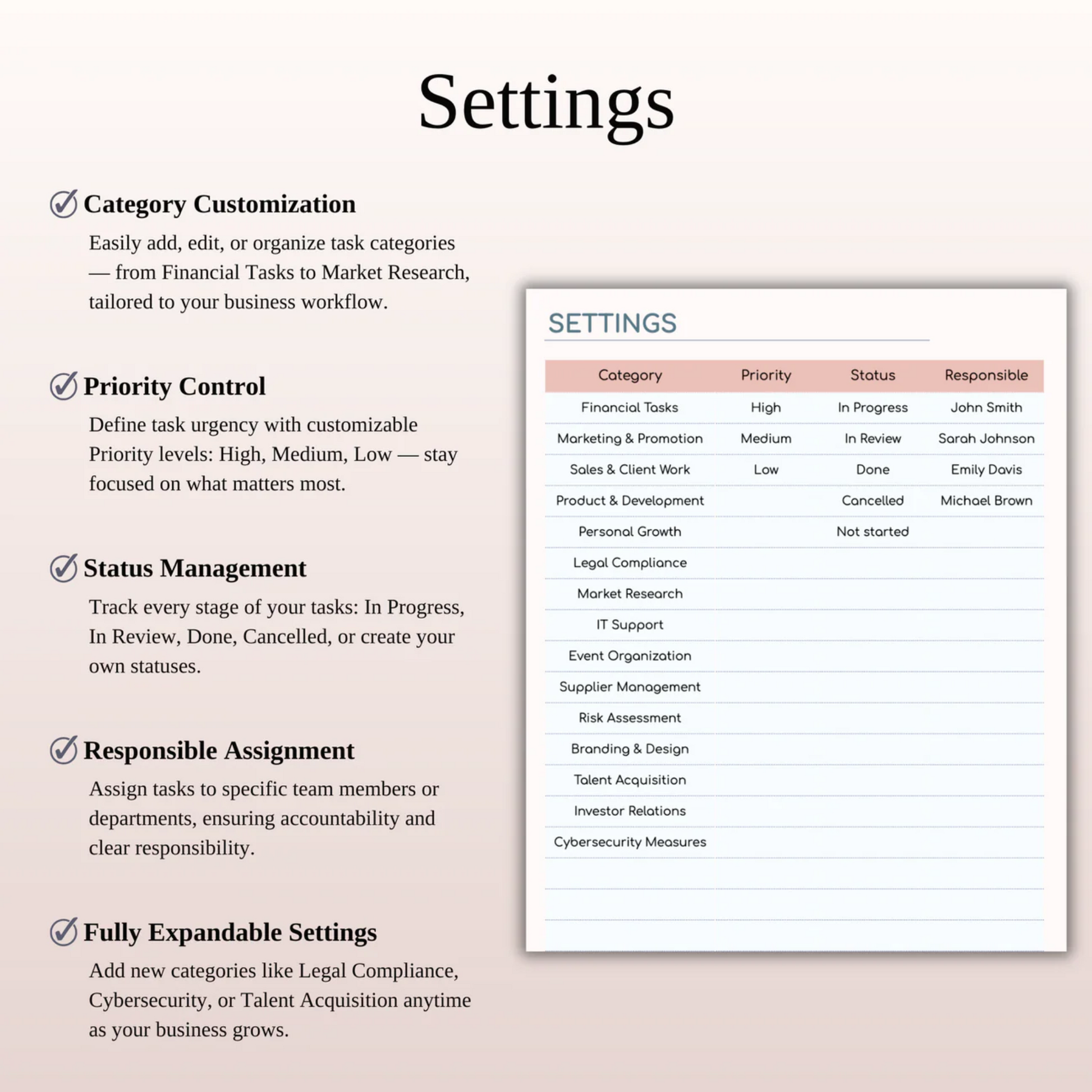 Flexible Settings Sheet: Personalize task categories, priorities, statuses, and team members to suit your business or personal needs.
